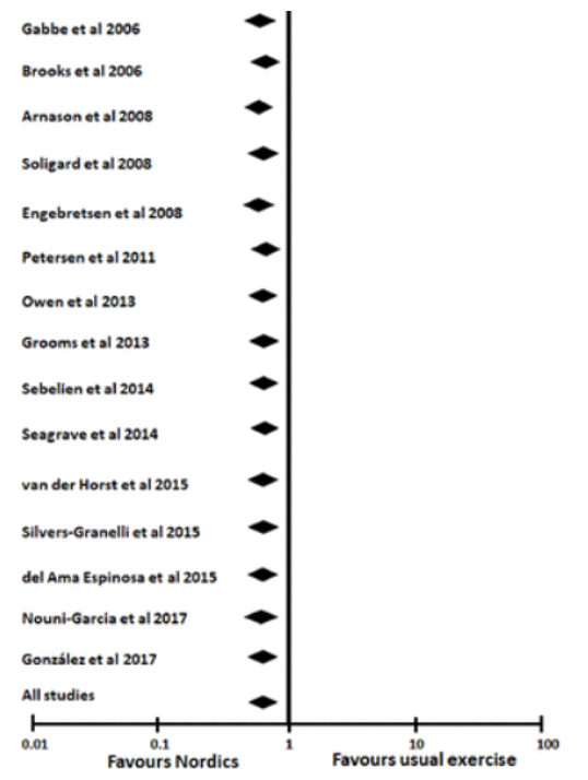 Falando agora do exercício nórdico, talvez o mais investigado a nível científico, assume um papel primordial na redução de lesões em até 51% (van Dyk, Behan, & Whiteley, 2016). Outro dado interessante neste estudo é o facto de comprovar cientificamente que usar os exercícios nórdicos parece que ser quase "obrigatório" para qualquer treinador de força e condicionamento que queira implementar um programa da redução de lesões nos isquiotibiais. Mostra também que estes podem ser realizados individualmente num programa ou em conjunto com outros exercícios preventivos. Assim não há dúvida nenhuma que os exercícios nórdicos são encorajados a serem feitos em qualquer programa preventivo devido a ter um grande suporte de evidências científicas que defendem o uso e pratica do mesmo. Este é capaz de promover o aumento do comprimento dos fascículos, levando a alterações morfológicas que podem proteger o músculo isquiotibial de lesões. Harøy et al. demonstraram que, ao realizar o exercício nórdico como parte de um programa de prevenção, observa-se um aumento na força; o aumento da força excêntrica pode reduzir o risco associado a uma lesão nos isquiotibiais.